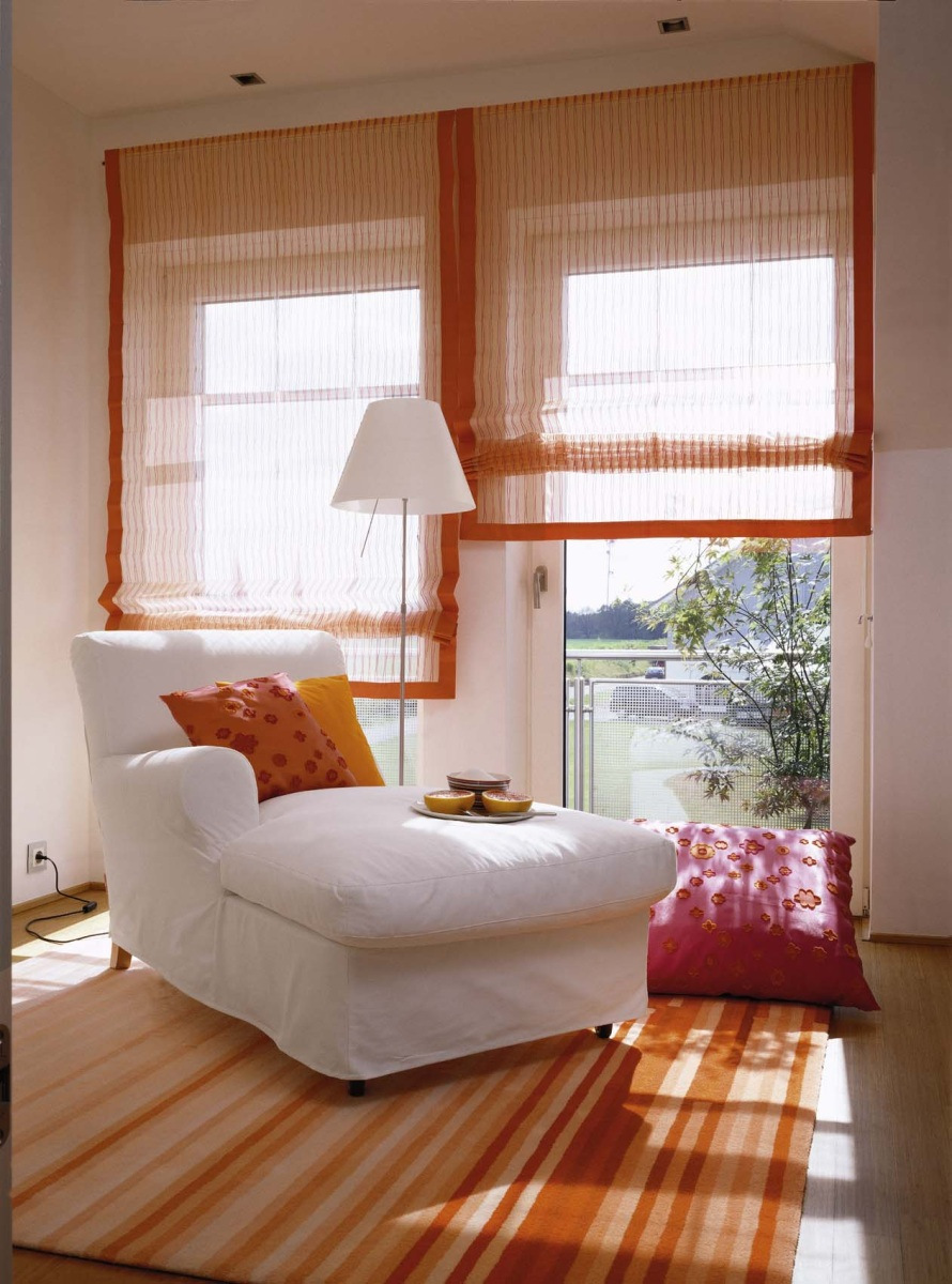 Изящно смотрятся римские шторы на узких окнах, но если ширина оконного проёма большая, можно использовать двойное или тройное полотно.